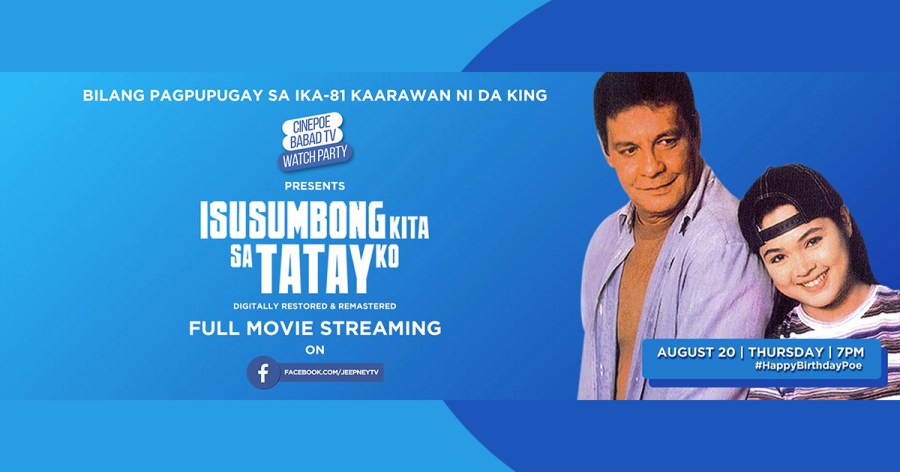 Fans of the King of Philippine cinema, the late Fernando Poe Jr., are invited to join the watch party of the “Isusumbong Kita Sa Tatay Ko” movie on Jeepney TV’s Facebook page this Thursday (August 20) in honor of FPJ’s 81st birthday. “Isusumbong Kita Sa Tatay Ko’s” remastered version, first time to be streamed on digital, …