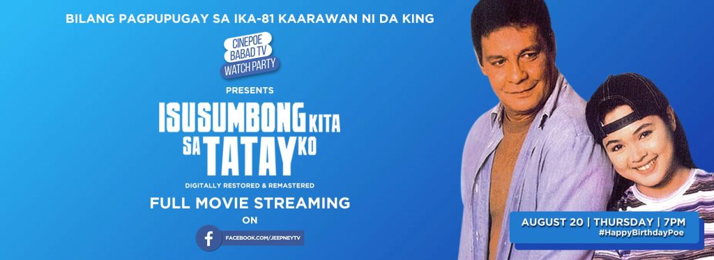 Fans of the King of Philippine cinema, the late Fernando Poe Jr., are invited to join the watch party of the “Isusumbong Kita Sa Tatay Ko” movie on Jeepney TV’s Facebook page this Thursday (August 20) in honor of FPJ’s 81st birthday.
