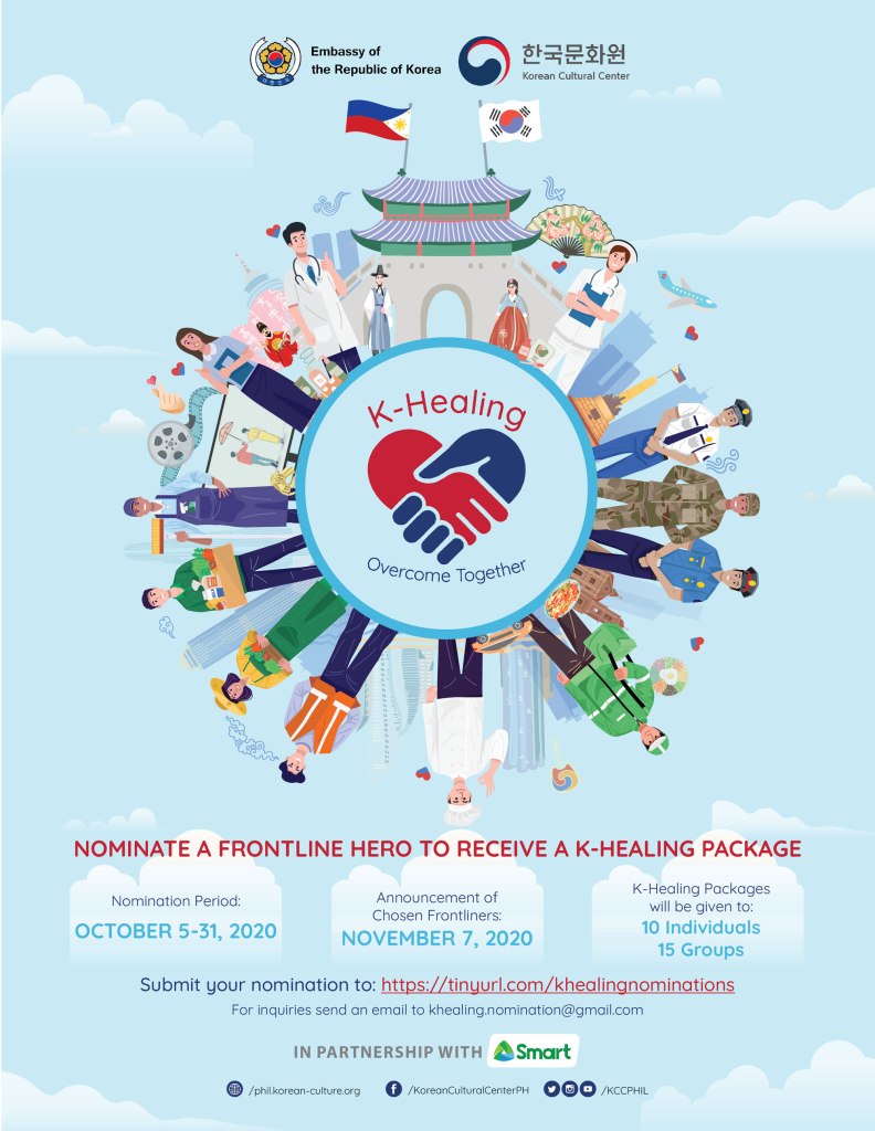 Selected entries will be announced on November 7, 2020, at 5:00PM, through KCC’s official social media accounts. Selected nominees will also be notified via email and through the contact number provided in their nomination form. Selected nominees can expect to receive their K-Healing Packages between November 9-20, 2020.