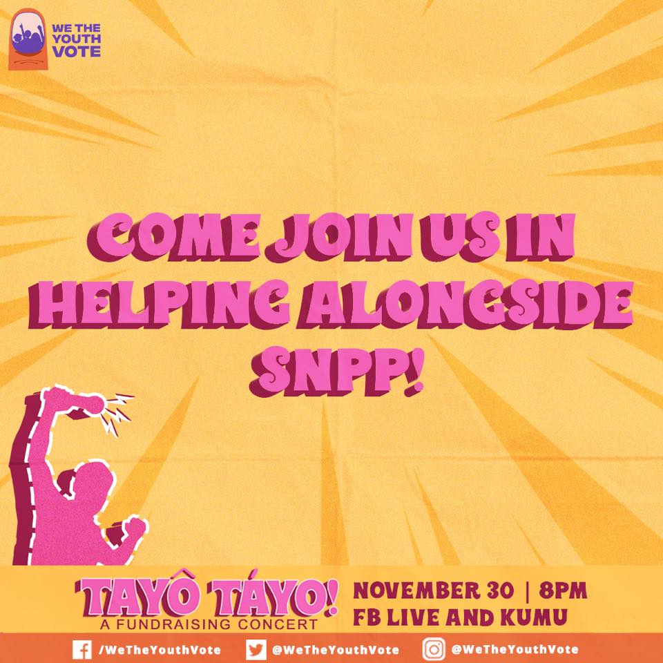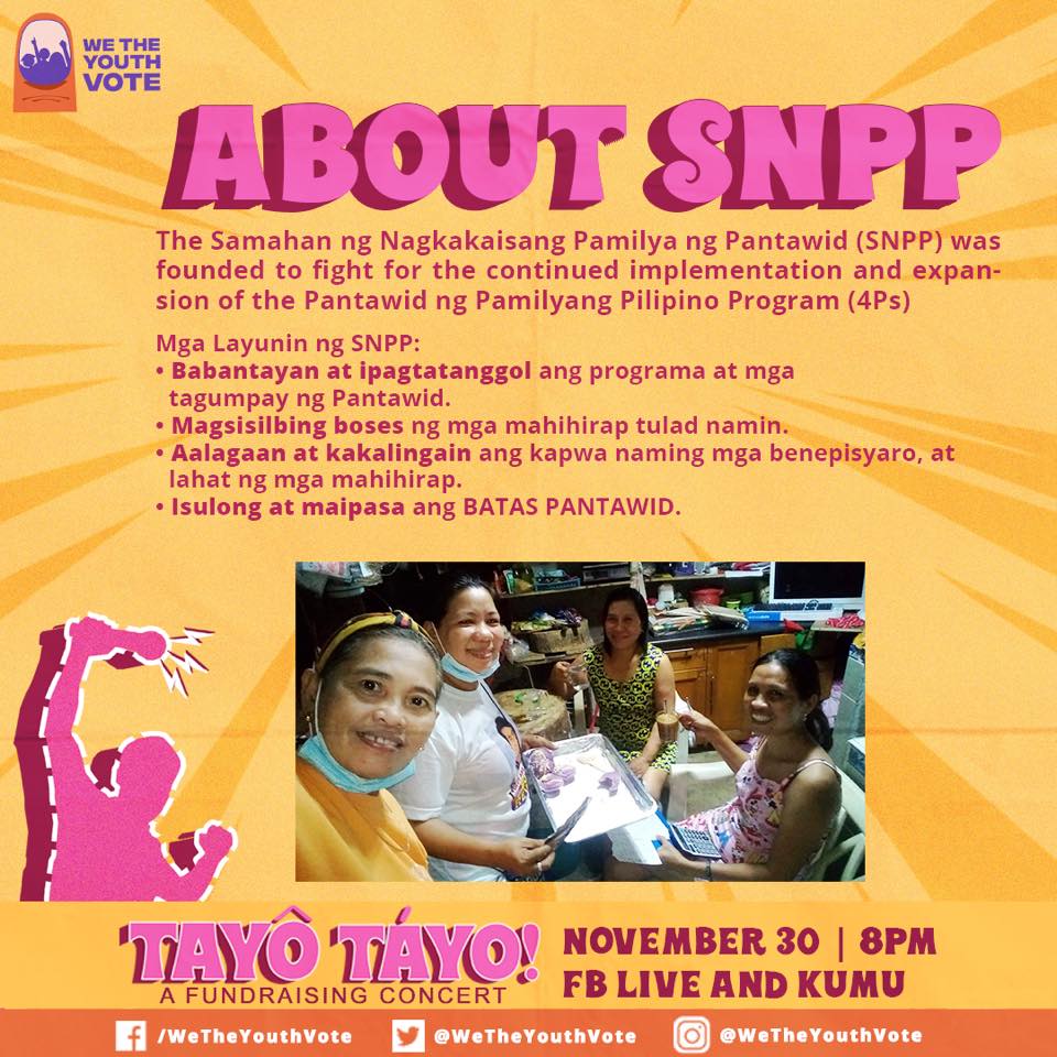 It is not an easy task but who else will help and inspire each of the most affected ones to rise up and move forward? Us, Filipinos through our very own custom ‘bayanihan.’ This is what We The Youth Vote (WTYV) wants us to be reminded of as the non-partisan group holds an online fundraising concert for the benefit of the Samahan ng Nagkakaisang Pantawid ng Pamilya (SNPP), an organizational community that champions the continued implementation of expansion of the government’s Pantawid Pamilyang Pilipino Program.