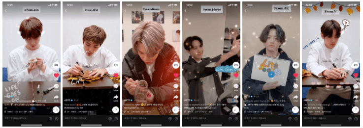 BTS also participated in the challenge and connected with their fans by releasing TikTok videos of their own: Jin goes through a flipbook, RM and V does maple leaf art, Jimin decorates a glass bottle, j-hope takes Polaroid pictures and JungKook practices calligraphy. In response, the group’s fans, ARMY, uploaded videos of themselves dancing and singing along to the new song, as well as moments in their daily lives with friends and family.