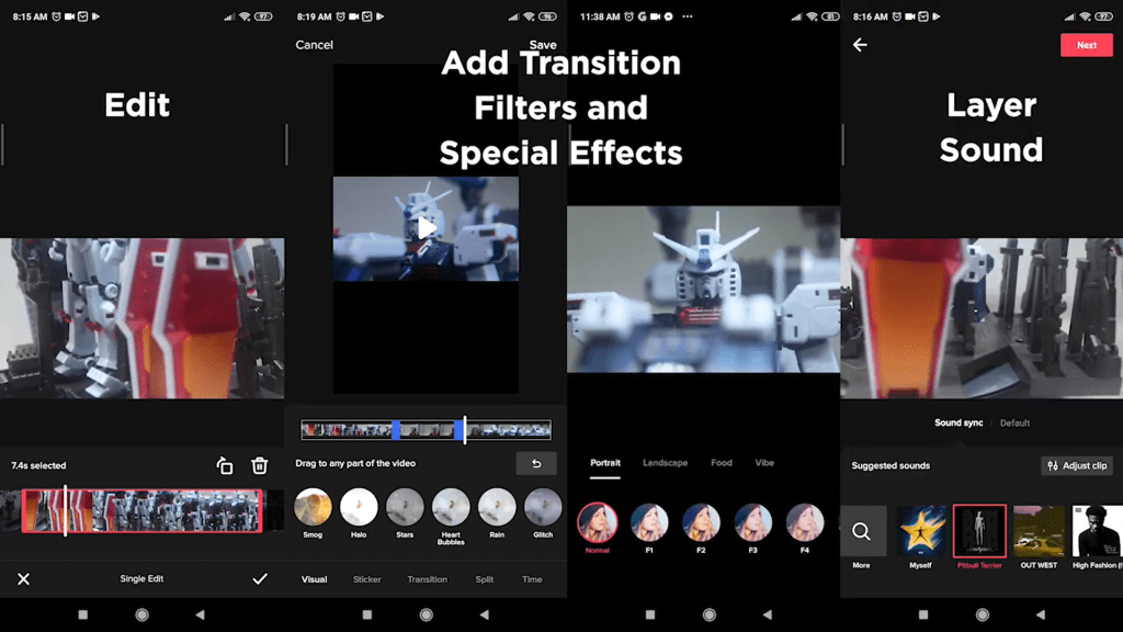 You can edit videos within the app, and add transitions, filters, special effects, and music, to make your content more fun to watch.