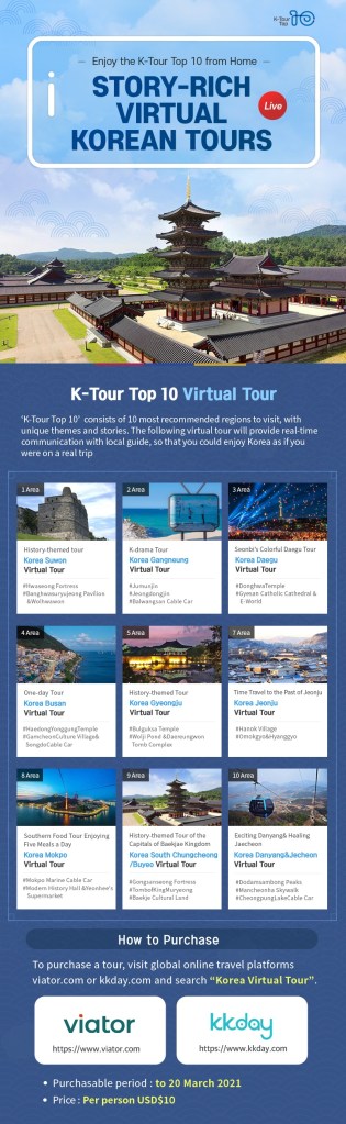 The Ministry of Culture, Sports and Tourism (MCST, Minister Park Yang-woo) and the Tourism Development Institute (TDI, Director Lee Dong-won) announced that they will launch virtual “K-tour Top 10” themed excursions to enable people to experience Korea’s beautiful tourist attractions online and learn their stories.