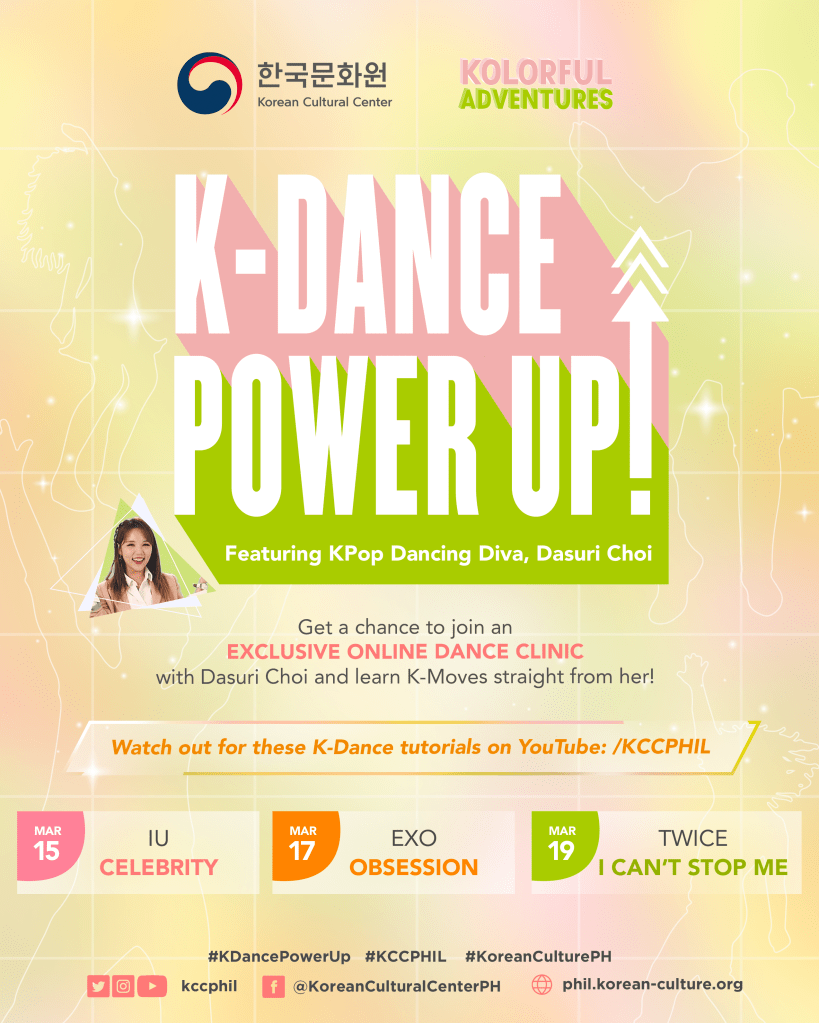 K-Pop Dancing Diva Dasuri Choi is once again taking on the KCC’s dancing stage as part of “K-Dance Power Up!” This leveled up online dance tutorial will feature the most-requested songs on KCC’s SNS namely: EXO’s powerful “Obsession,” Twice’s megahit “I Can’t Stop Me,” and IU’s newly-released dance single, “Celebrity.” Aside from getting the chance to learn the said K-pop songs’ moves and grooves at home together with friends and family, randomly selected participants can also get the chance to participate in the exclusive online dance clinic facilitated by Dasuri herself. Those who wouldn’t be as lucky, however, would still have the chance to participate in the K-Dance Power Up! Quiz wherein they would be expected to answer specific questions correctly in order to receive special KCC prizes.