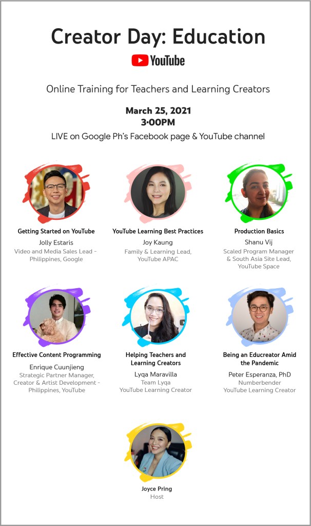 Join the “Creator Day: Education” on March 25, 2021, Thursday at 3:00PM on the local YouTube channel and Facebook page of Google. Register via http://bit.ly/CreatorDayEdu.