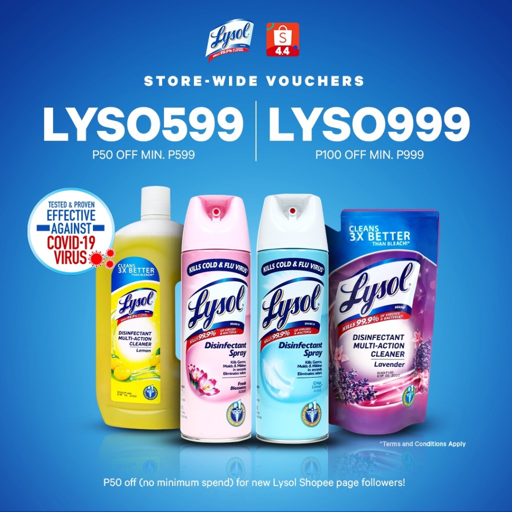 Mark your calendars and ‘add to cart’ the Lysol disinfectants and multi-action cleaners at special discounted prices during Shopee’s 4.4 Sale! Vouchers are limited and only one voucher can be used per check out. Log on to the official Lysol Shopee page through this link.