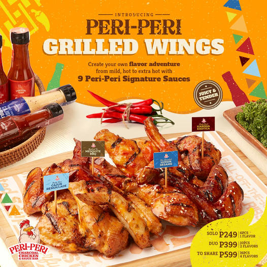 You can enjoy Peri-Peri’s Grilled Wings either Solo at P249 (6 pcs, 1 flavor), Duo at P399 (10 pcs, 2 flavors), or To Share at P599 (16 pcs, 4 flavors). Have them anytime for your me-time or when you’re with family or friends.