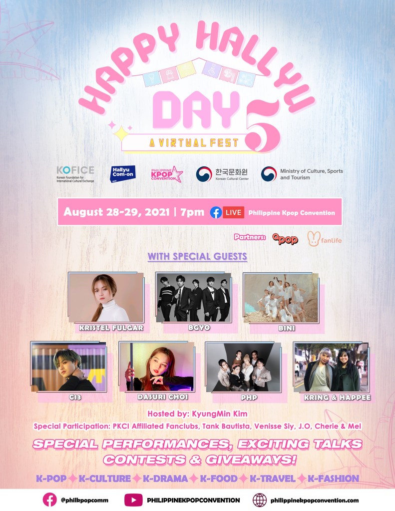 “Happy Hallyu Day” turns five and everyone is invited to a virtual fest this coming August 28-29, 2021, 7 PM on the Philippine Kpop Convention Inc. Facebook Page! Celebrate Korean Wave with K-entertainment talks, K-pop performances, contests, games, and more together with PKCI and Korean Cultural Center in the Philippines.