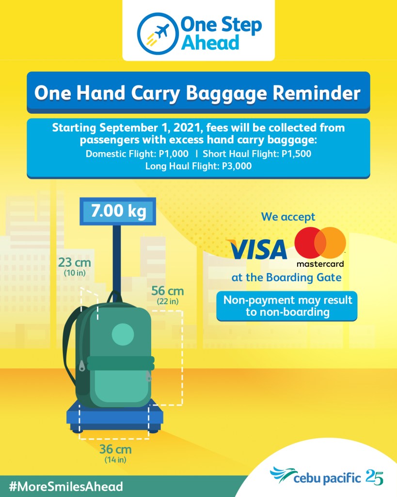 Cebu Pacific reminds its passengers to bring only one hand carry bag during their travels to ensure a smooth and convenient flight experience. The carry-on bag must not exceed 7 kilograms in weight and its size must fit in the overhead bin or under the aircraft seat.