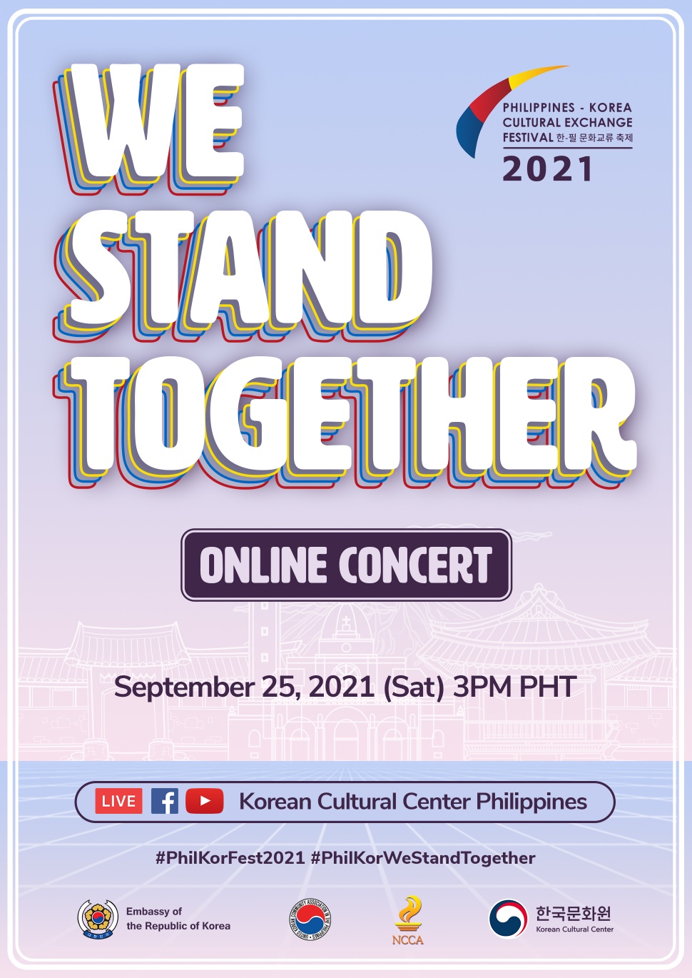Organized by the Embassy of the Republic of Korea, and the Korean Cultural Center in the Philippines together with the United Korean Community Association (UKCA) and the National Commission for Culture and the Arts (NCCA), ‘WE STAND TOGETHER’ Online Concert, will be happening this September 25, 2021 (Sat) at 3PM PHT. The event would feature performances from Filipino and Korean artists and can be streamed for free via Korean Cultural Center in the Philippines Facebook and YouTube pages, which would also be streamed at the UKCA and NCCA Facebook Pages.