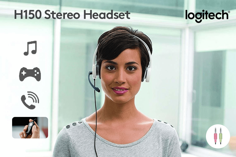 Versatile and adjustable, the dual plug H150 Stereo Headset is great for computers that use separate 3.5mm microphone-in and audio-out ports. The noise-cancelling microphone of this headset reduces background noise effectively, and its in-line controls allow you to adjust volume and mute calls without disruption.