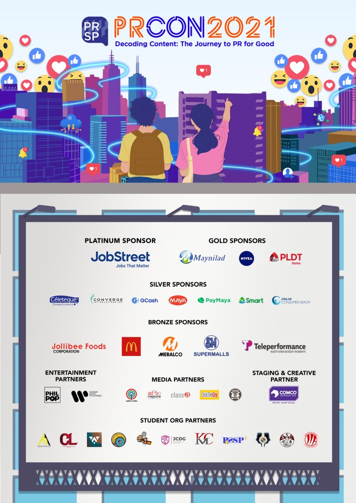 The PRSP Students’ PR Con 2021 is supported by JobStreet as platinum sponsor; Maynilad Water Services, NIVEA and PLDT as gold sponsors; Converge ICT Solutions, GCash, Maya, PayMaya, Smart, Unilab Consumer Health and Unilab Skin Sciences as silver sponsors; and Jollibee Foods Corporation, McDonald’s Philippines (Golden Arches Development Corporation), Meralco, Teleperformance and SM Supermalls as bronze sponsors. Staging and creative partner is COMCO Southeast Asia while media partners are ABS-CBN, Adobo Magazine, Class A Magazine, ClickTheCity.com and WhenInManila.com. Entertainment partners are Warner Music Philippines and PhilPop Musicfest Foundation.