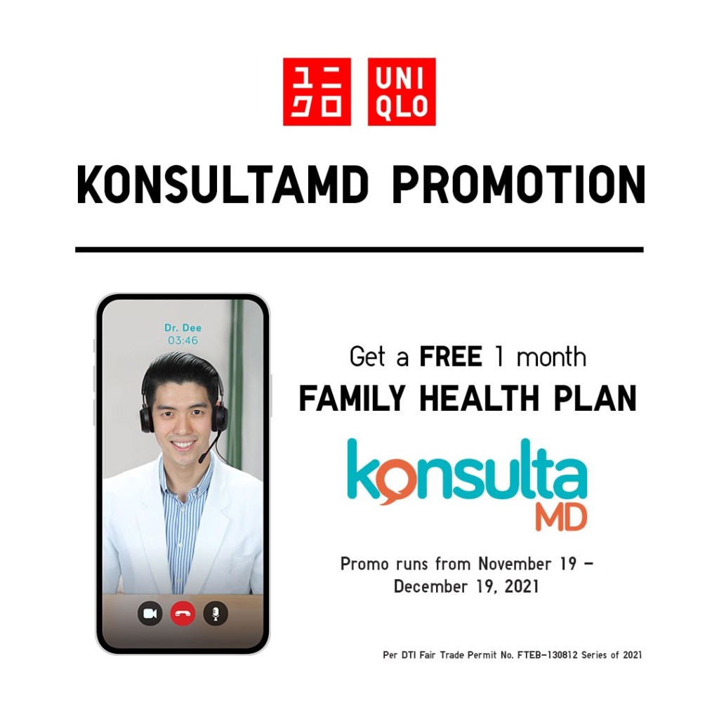 Shoppers can get a FREE KonsultaMD Family Health Plan until December 19, 2021, for a minimum purchase of P4,000 at Uniqlo Philippines stores and online. The health plan covers one-month membership for a primary member plus four dependents, unlimited voice consultations, and four video consultations. It also includes access to e-prescriptions, e-documents, e-Laboratory requests, e-Medical Certificates, and other partner benefits.