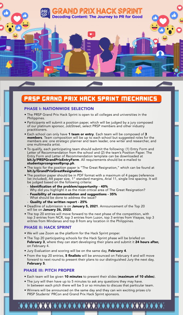 To learn more about the PRSP Students’ Grand Prix Hack Sprint 2021, follow www.facebook.com/studentsprcongress or linkedin.com/company/prsp-students-pr-con-and-grand-prix. For inquiries, please email studentsprcongress@prsp.ph.