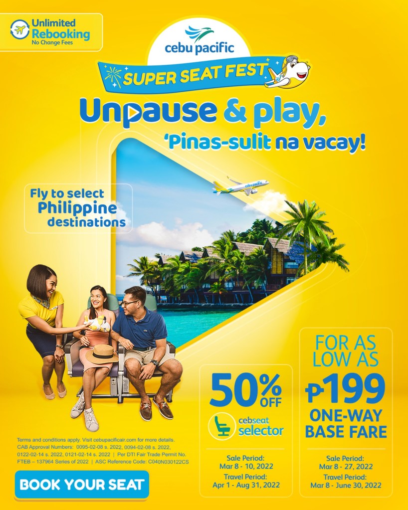 In addition to Cebu Pacific’s anniversary seat sale, the airline will also be offering 50 per cent off on its seat selector service from March 8 to 10, for flights departing from April 1 to August 31, 2022. Passengers can fly easily with their preferred seats where they can choose either a window or aisle seat, or rows near the exits with an extra legroom option. This deal is also available for passengers with existing bookings.