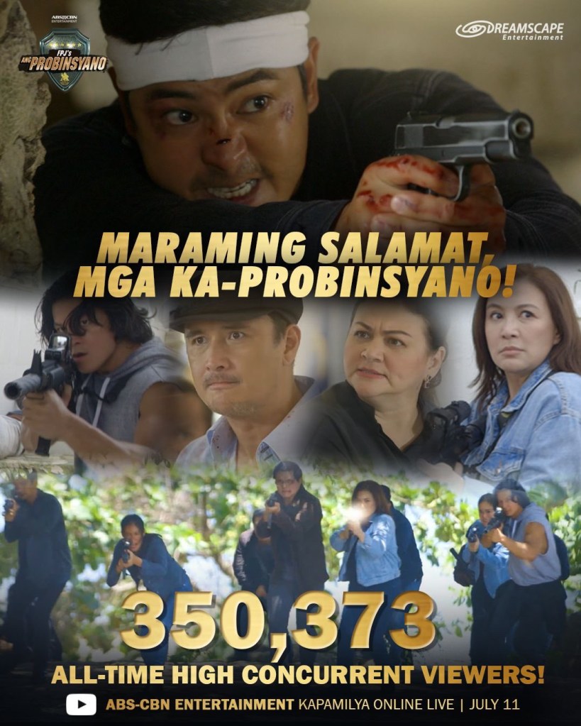 Lolo Delfin (Jaime Fabregas) may have met his unfortunate demise as he made a last-ditch effort to save his grandson Cardo (Coco Martin) in another action-packed episode of “FPJ’s Ang Probinsyano,” that broke its own record anew and hit an all-time high of 350,373 live concurrent views on Kapamilya Online Live on YouTube on Monday (July 11).