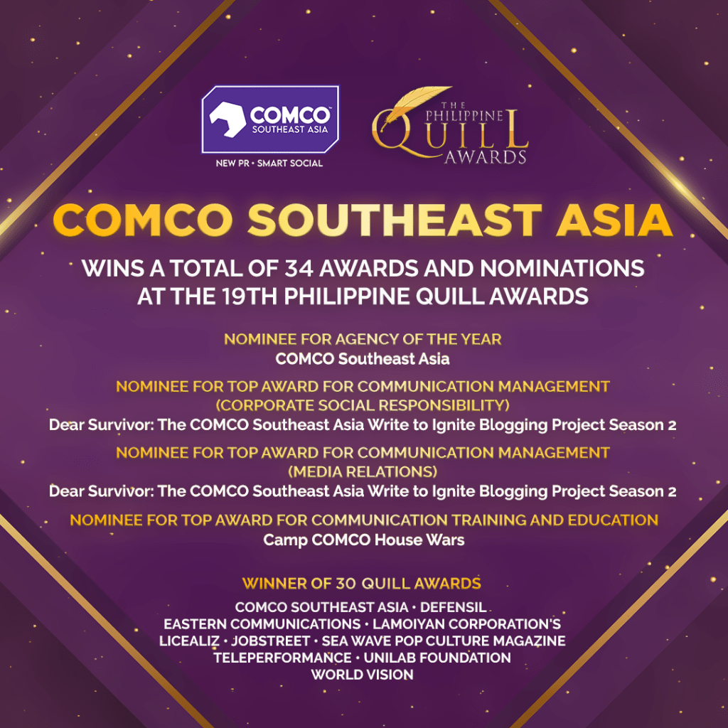 Trailblazing communications agency COMCO Southeast Asia received 30 awards and 4 top award nominations for various projects from the prestigious 19th Philippine Quill Awards of the International Association of Business Communicators (IABC). This year’s Quill Awards, titled ‘MOVE,’ is the biggest one yet with winners selected from a pool of over 800 entries after rigorous evaluation and deliberation.