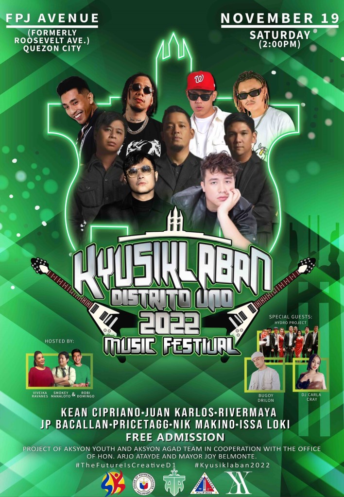 QUEZON City District 1 (QCD1) Representative Arjo Atayde, as vice-chair of the Creative Industry and Performing Arts Committee of the 19th Congress, is set to promote Original Pilipino Music (OPM) to the youth of the district in the upcoming event titled Kyusiklaban Distrito Uno 2022 –Music Festival on November 19 (Saturday) along FPJ Avenue (formerly Roosevelt Avenue) from Pitimini Street to Del Monte Avenue in Quezon City.