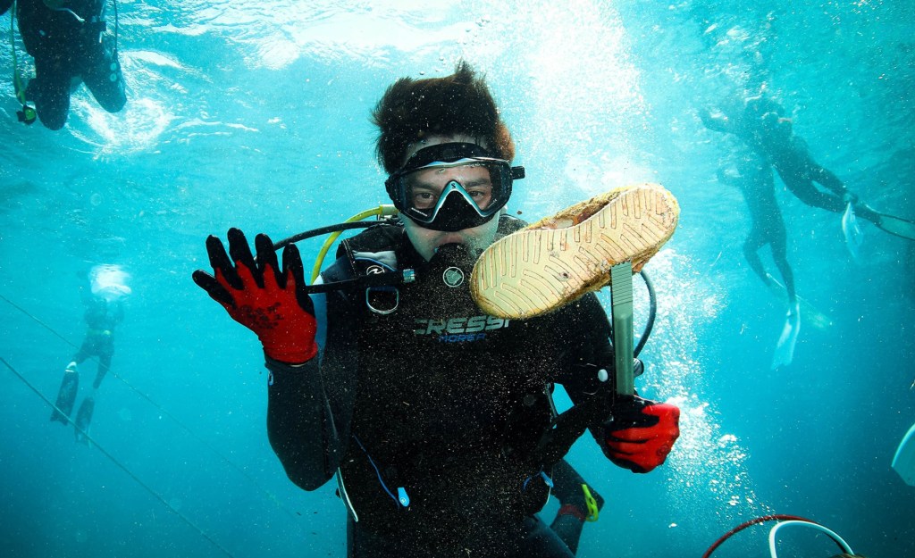 Century Tuna Ambassador Alden Richards shows a piece of shoe he found during the reef cleanup.