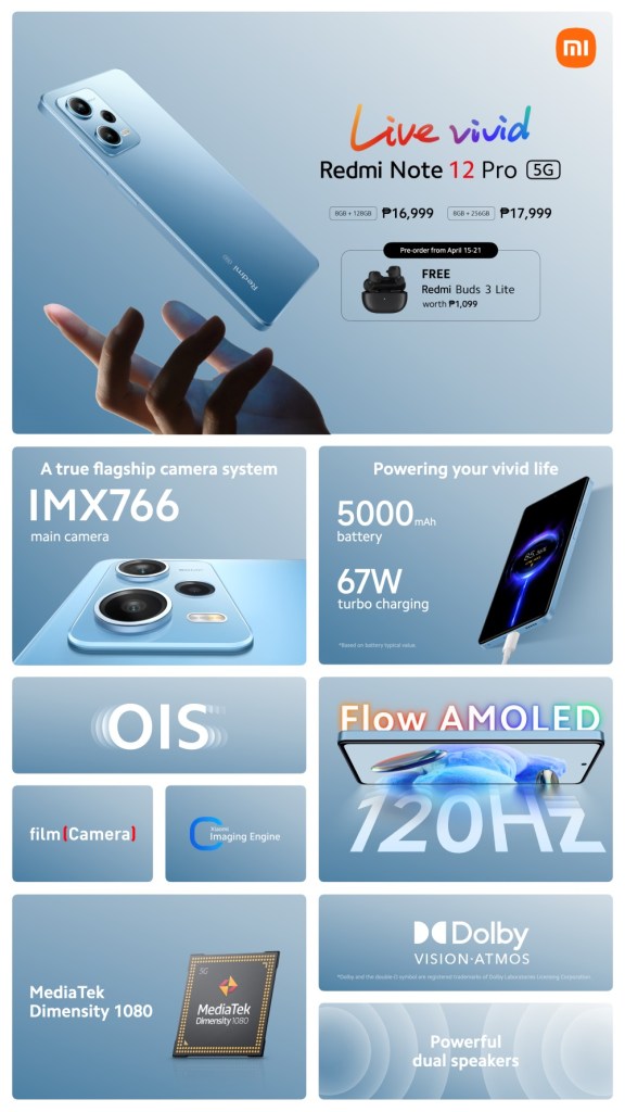 The Redmi Note 12 Pro+5G (8+256GB) retails at PHP 21,999 and is bundled with a complimentary Redmi Buds 3 Lite as part of the pre-order promo, which runs from April 15 to 21, 2023. The Redmi Note 12 Pro 5G, on the other hand, is offered in two options: the 8+128GB variant priced at PHP 16,999 and the 8+256GB model at PHP 17,999, both of which also include a free Redmi Buds 3 Lite for pre-order customers. Customers may purchase these devices online through Xiaomi’s official stores in Lazada, Shopee, and TikTok Shop as well as Authorized Xiaomi Stores and partner retailers nationwide. For those who want flexible payment options, Home Credit financing is available at 0% interest.