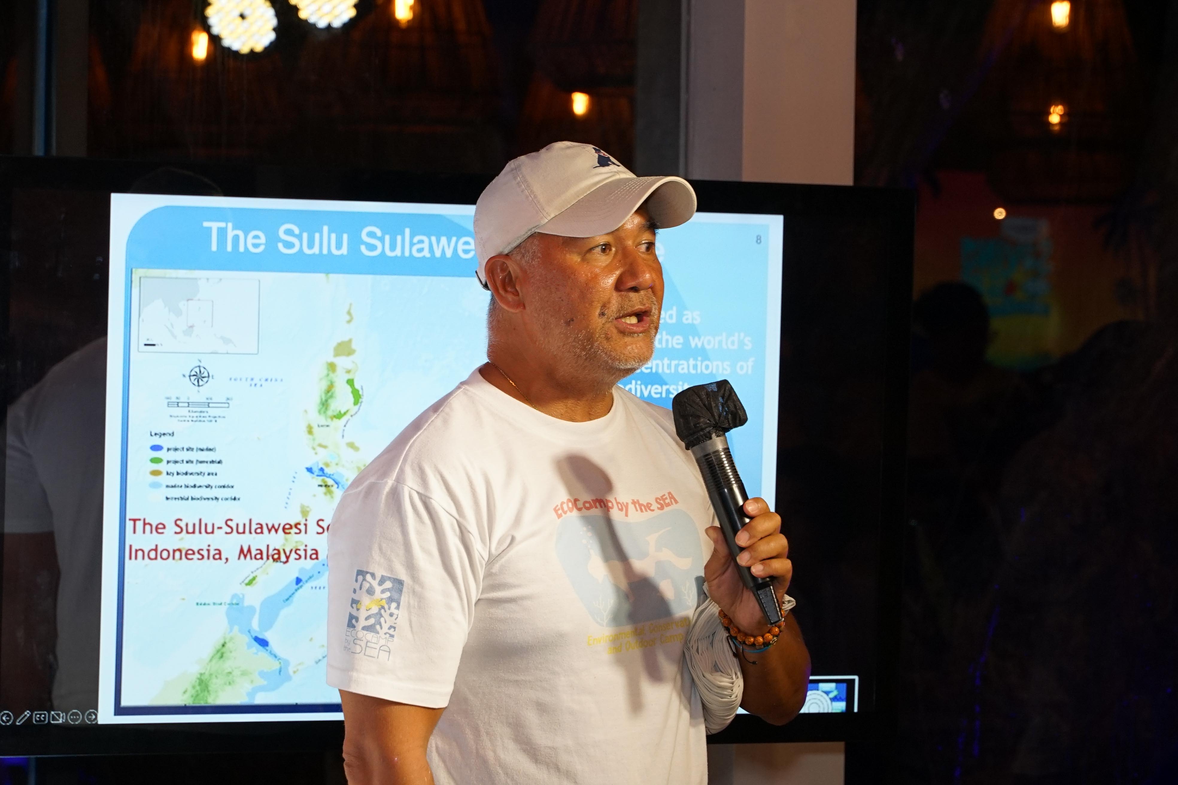 Marine Conservationist Robert Suntay, Anilao Dive Instructor Avic Maramot, and Mabini Tourism Representative Ian Bueno during the program primer