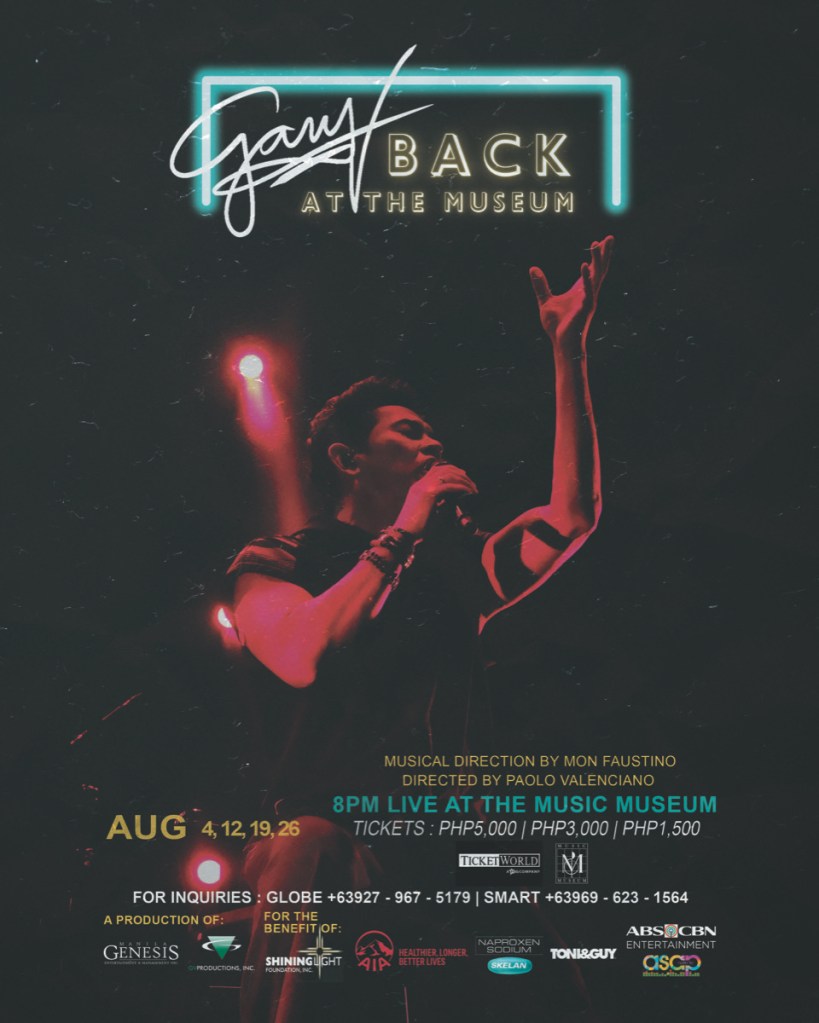 The setlist of Gary V: Back At The Museum showcases his greatest hits. He will share the stage with his daughter Kiana, who will fly in from the US for a special guest appearance, and the Manoeuvres. His eldest son Paolo will direct the show, and Mon Faustino will handle the musical direction. Soundcheck will provide technical support. This series’ sponsors include ABS-CBN, AIA Philippines, ASAP Natin ‘To, Skelan, Globaltronics, the Philippine STAR, Partners in Christ Foundation, and Toni&Guy.