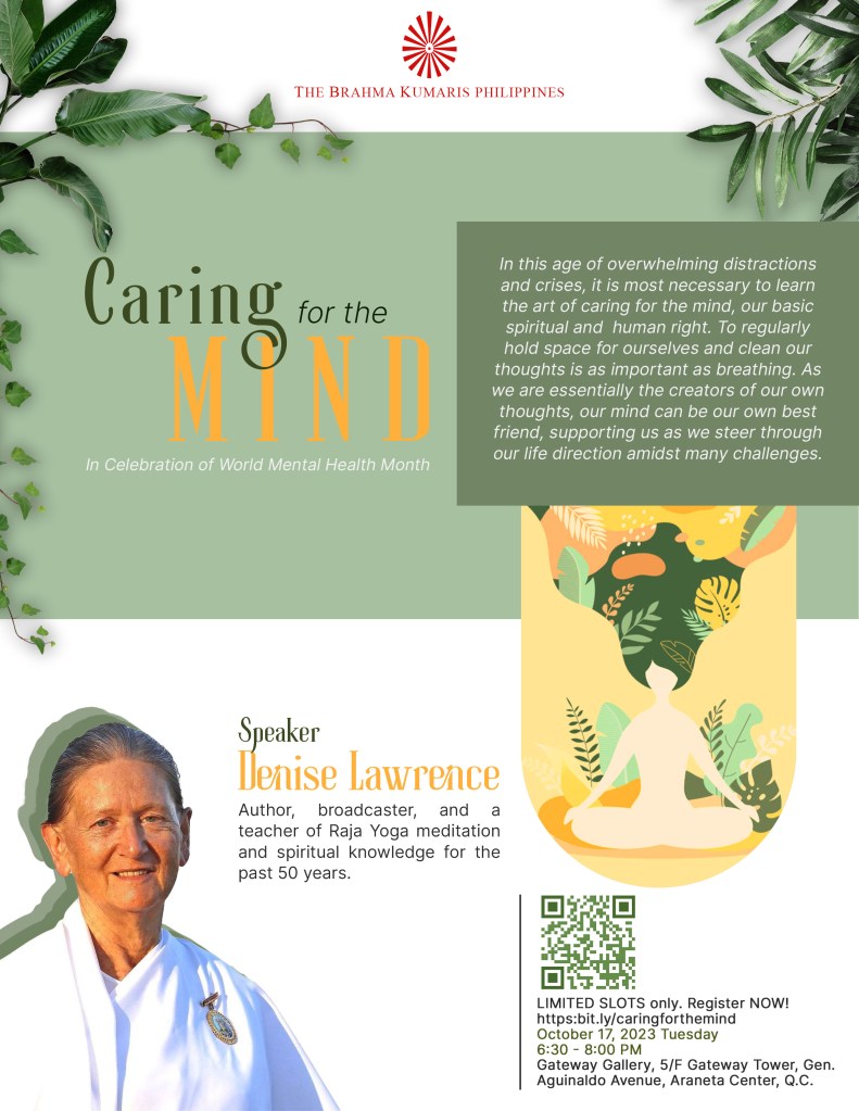 The October 17 seminar is free for everyone. Interested participants may register via: bit.ly/caringforthemind or get in touch with BKPH FB via https://web.facebook.com/BrahmaKumarisMeditation.