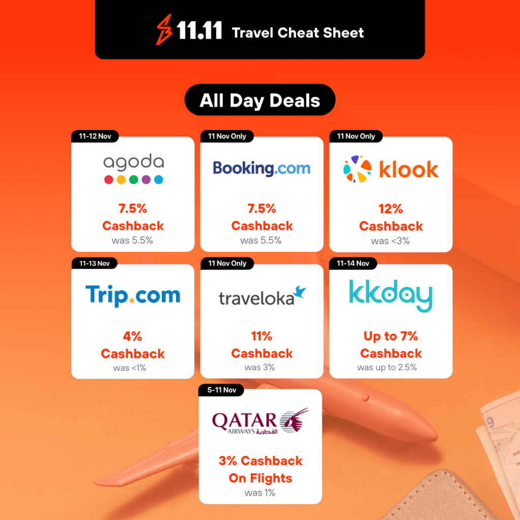 This is where it gets exciting – the cashback rates for your favorite brands. For example – Uniqlo is giving up to 15% cashback this 11.11. That means for a P10,000 purchase you get P1,500! That is enough for another outfit! You can maximize your savings further with travel – where you can get cashback deals from Agoda and Booking.com – for a P10,000 hotel stay you get P750 back!