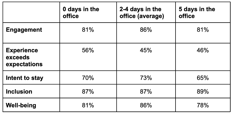 The table shows how employees globally feel a fully remote (0 days in the office), hybrid (2-4 days in the office), or full return-to-office work setup.