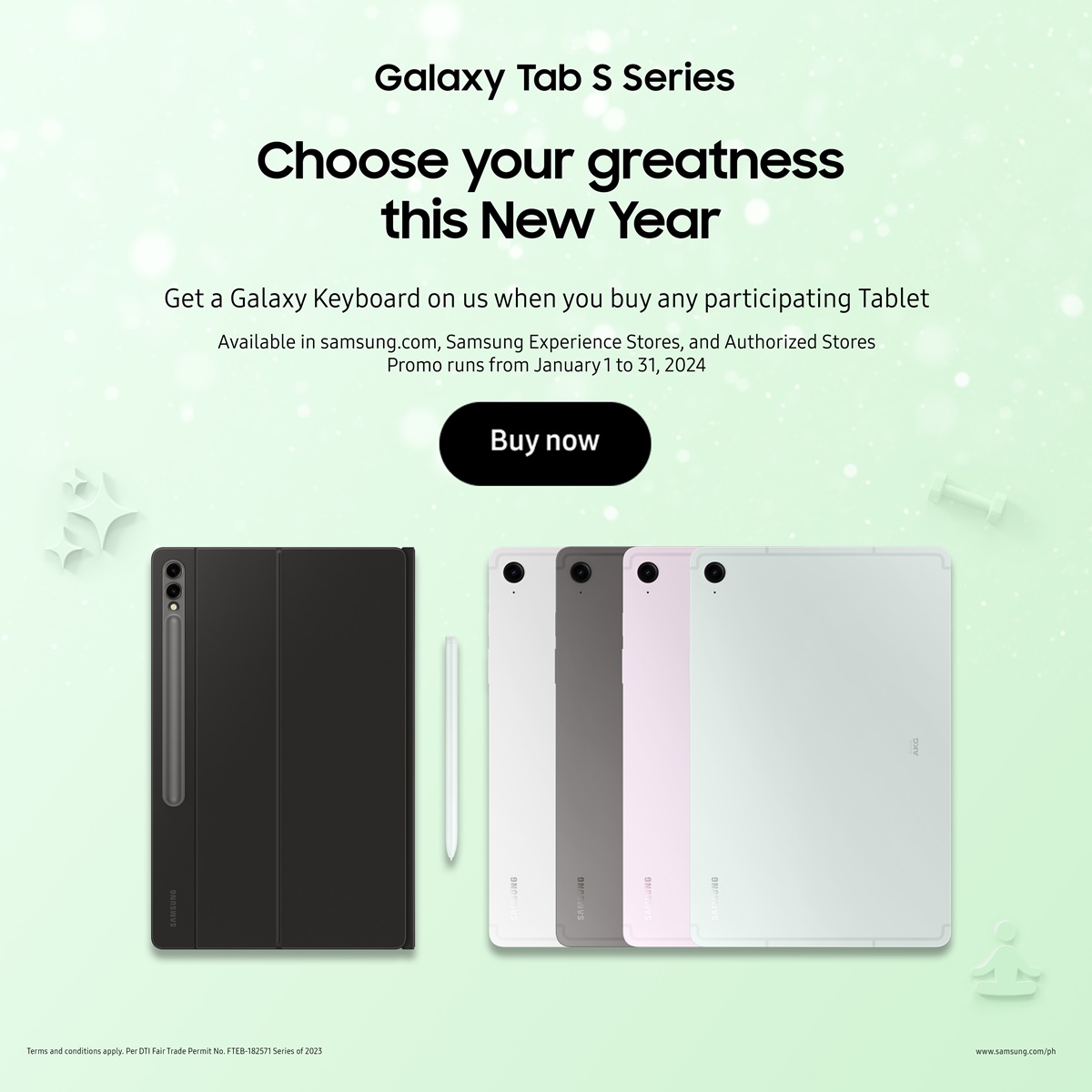 Grab a Galaxy Tablet this New Year with fantastic discounts. Enjoy P5,000 off with the Tab S9 Ultra, S9+ and S9, or P3,000 off with the Tab S9 FE+. All of them come with a free keyboard slim cover. You can also get the Tab A9 and A9+ for P3,000 off.