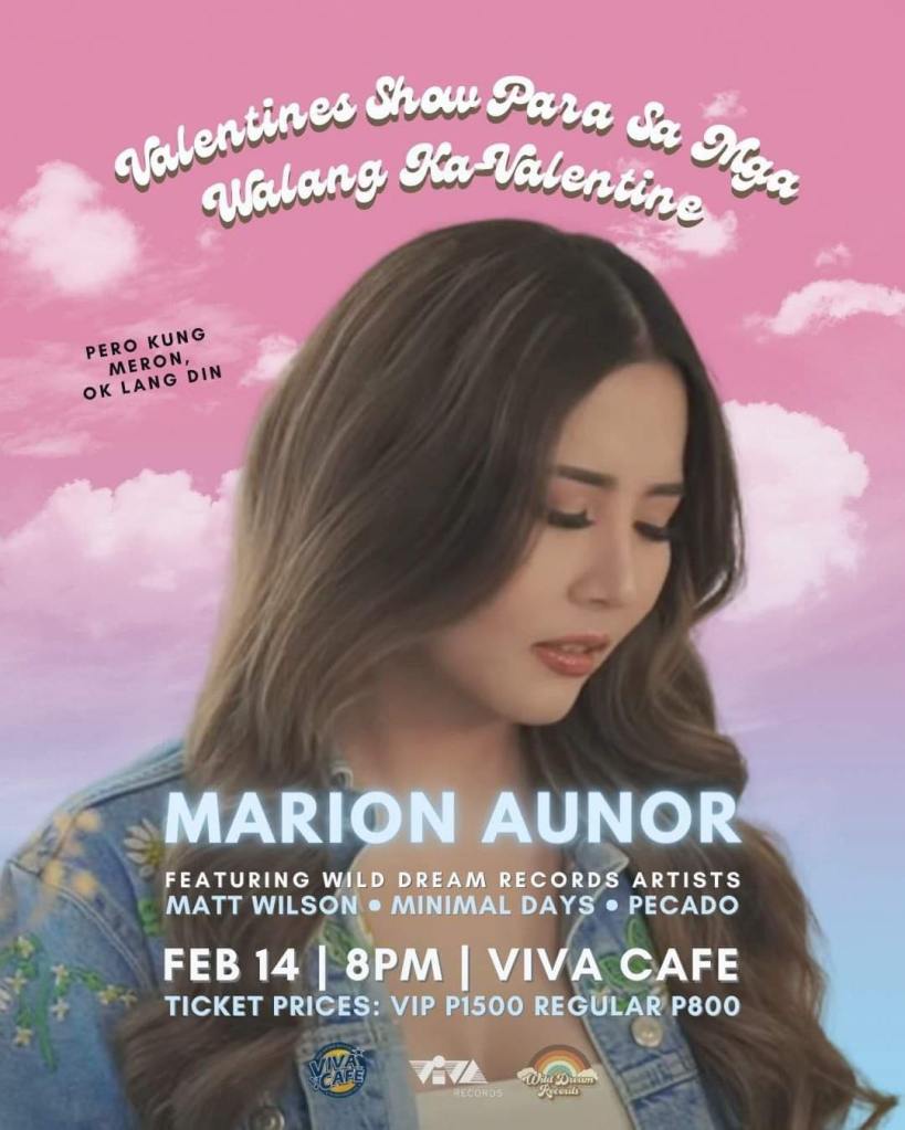 Tickets for Valentine’s Show Para Sa Walang Ka-Valentine are available directly through Viva Cafe. For exciting news and updates on Marion Aunor, follow her socials on Instagram (@marionaunor), Facebook (Marion Aunor), TikTok (@marionaunor), and YouTube (Marion Aunor Official).