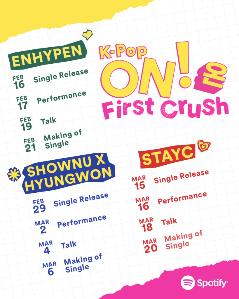 The Spotify Singles for the K-Pop ON! (온) First Crush campaign are set to drop exclusively on Spotify every two weeks, starting with ENHYPEN’s release on February 16. SHOWNU X HYUNGWON’s Spotify K-Pop ON! (온) Single will launch next on February 29, followed by STAYC’s release on March 15.