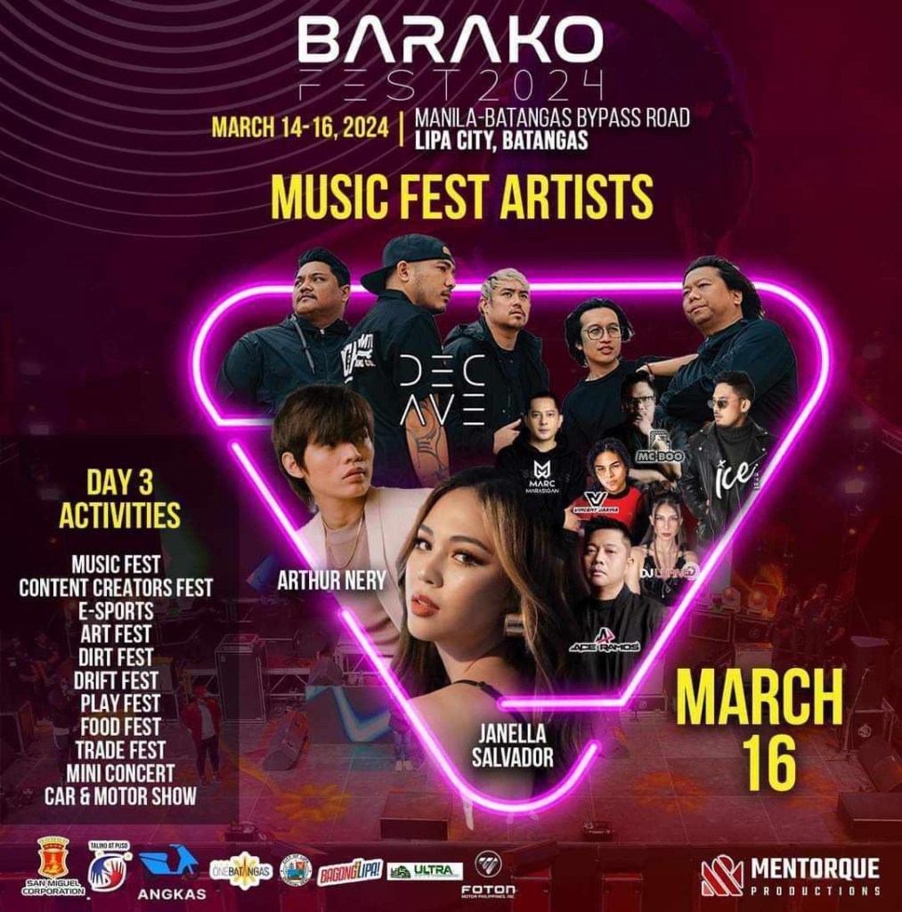 The BarakoFest 2024 will happen from March 14-16 at the Manila Batangas Bypass Road in Lipa, Batangas.