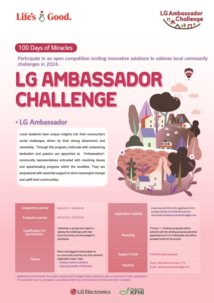 Continuing its steadfast dedication to fostering positive change within communities since 2022, LG is proud to announce the reopening of entries for the LG Ambassador Challenge, effective March 1, 2024. Spearheaded by LG Philippines and Korea Food for the Hungry International (KFHI), this global initiative reaffirms LG’s unwavering commitment to actively engage in local communities and promote sustainable growth.