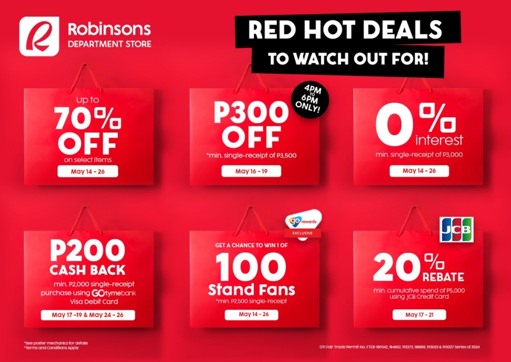 Members of Robinsons’ Go Rewards program are entitled to perks all year round. During this month’s Red Hot Sale, the perks have multiplied! Members can get the chance to win 1 of 100 stand fans for a minimum spend of P2,500 from May 14 to 26. You can also get P300 off on your purchases on May 16 to 19 from 4pm to 6pm for only for a minimum spend of P3,500.
