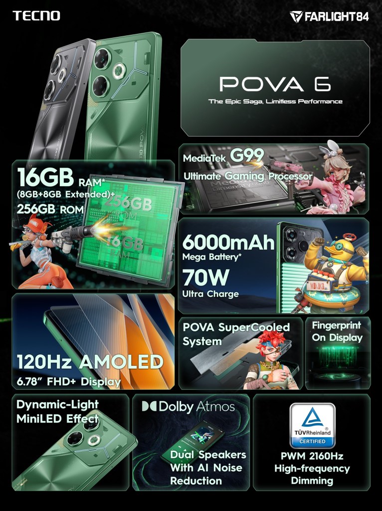 Ignited by elements of intelligence, technology and future, the TECNO POVA 6 sets out to lead users through a journey of a groundbreaking Dynamic-Tech Design with its futuristic aesthetics, hardcore tech features, and one-of-a-kind design excellence. Its revolutionary 6000mAh battery tech empowers the slim, lightweight body of TECNO POVA 6 at 7.88mm and 195g. It comes in three colors: comet green, meteorite gray, and interstellar blue. The POVA 6 will provide gamers with power beyond limits with its Mediatek G99 Ultimate processor, 256GB ROM and extended 8GB or 12GB RAM features, 108MP ultra vivid camera, 32MP ultra-clear front camera with dual-tone LED flash, and Dolby Atmos dual speaker.
