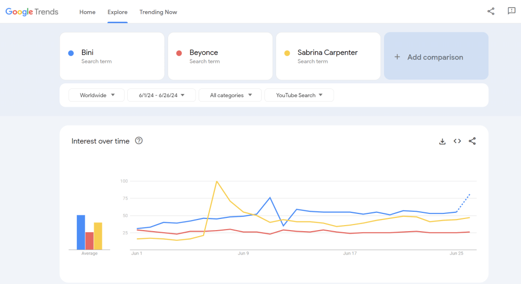 BINI also gained momentum around the world, being more searched than artists such as Sabrina Carpenter and Beyonce on YouTube for most of the month. Aside from the Philippines, the group was also more popular in the United Arab Emirates — around 700,000 Filipinos are part of the country’s population, more than half of which are in Dubai alone.