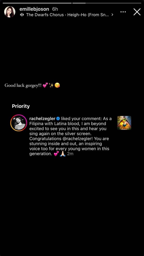 “As a Filipina with Latina blood, I am beyond excited to see you in this and hear you sing again on the silver screen. Congratulations, @rachelzegler! You are stunning inside and out—an inspiring voice for every young woman of this generation.”