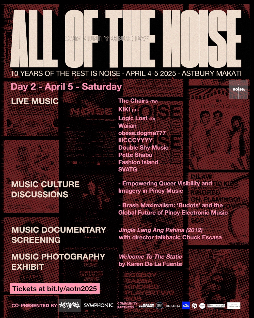 All Of The Noise 2025 is co-presented by Astbury Makati, an independent culture hub and private members club where the creative, cerebral, and social shift the status quo, and Symphonic Distribution, one of the leading independent music distribution and marketing companies in the industry.