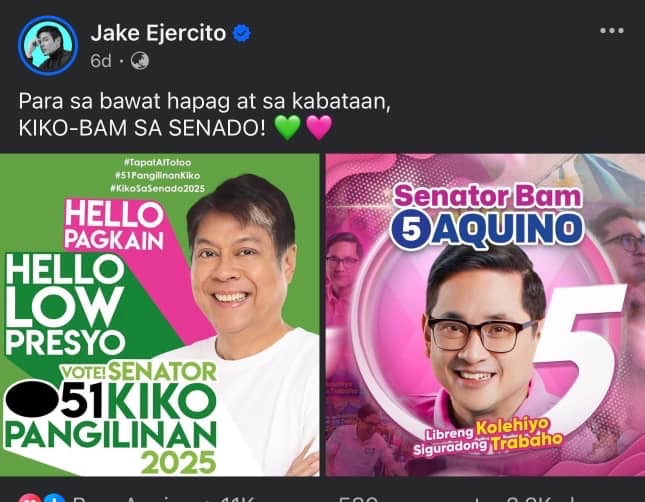 In a post on his social media accounts, Jake expressed full support for the two aspirants, saying, “Para sa bawat hapag at sa kabataan, KIKO-BAM!”