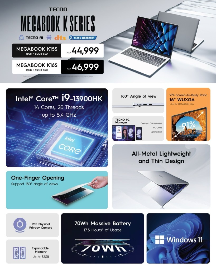 – Purchase the MEGABOOK K16s 13th (official price: ₱46,999) and also enjoy the “buy one get one free” offer, with the gift upgraded to a TECNO CAMON 40 Pro 5G8GB RAM+256GB ROM.