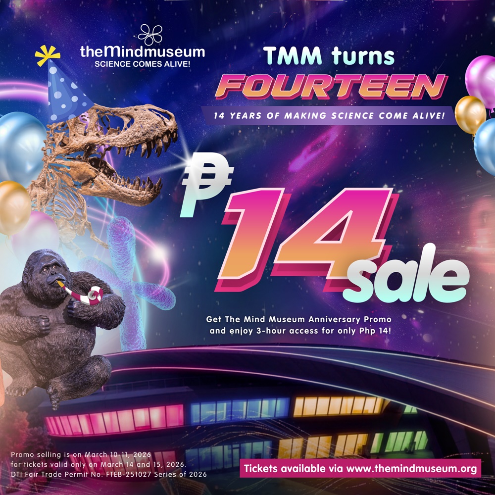 ₱14 Anniversary Promo: Enjoy 3-hour access to The Mind Museum for only ₱14. Book early as promo slots are limited per time slot (9:00 AM–12:00 NN, 12:00 PM–3:00 PM, 3:00 PM–6:00 PM), and a maximum of two tickets only can be purchased per person. Promo selling starts March 10, 2026, and is valid for visits on March 14–15, 2026 only.