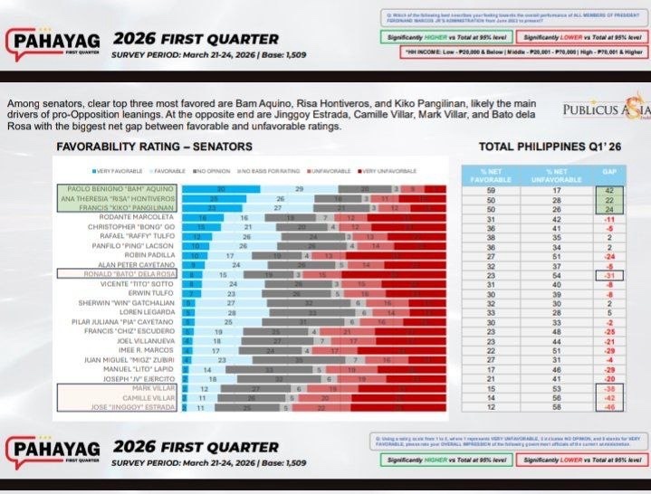 Senator Bam Aquino once again emerged as the most favored senator in Publicus Asia’s PAHAYAG 1st Quarter survey.