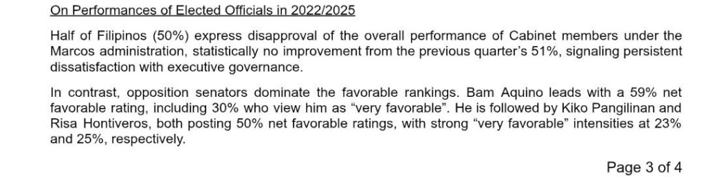 His fellow majority members – Senators Francis “Kiko” Pangilinan and Risa Hontiveros – placed second and third, respectively, both with identical 50 percent ratings, while Senators Rodante Marcoleta, Bong Go, Raffy Tulfo, Ping Lacson, Robin Padilla, Alan Peter Cayetano, and Ronald “Bato” Dela Rosa rounded out the Top 10.