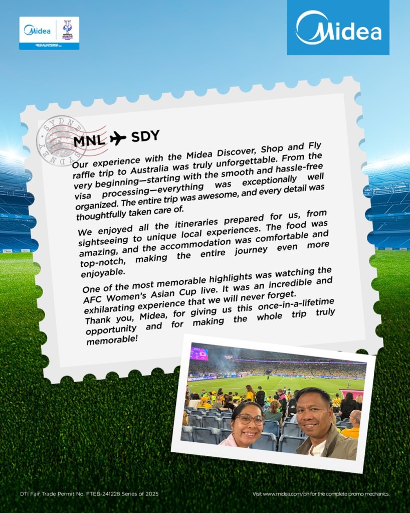 Dreams took flight for lucky customers of home solutions brand Midea Philippines as the Discover, Shop, Fly promo treated the two grand prize winners to a thrilling sports experience in Australia, where they were able to watch the Philippines Women’s Football Team compete at the recent 2026 AFC Women’s Asian Cup.